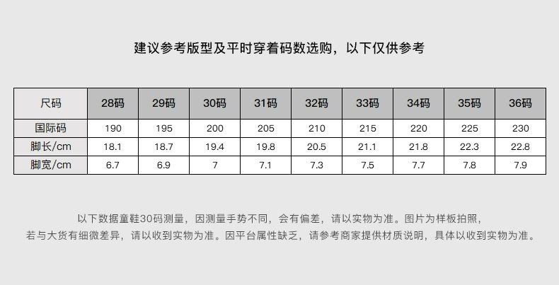 | 适合脚长(mm) | 110 | 120 | 125 | 130 | 135 | 140 | 150 | 155 | 160 | 170 | 175 | 180 | 190 | 195 | 200 | 210 | 215 | 220 | 230 | 235 | 240 | 245 | 250 | 255 | 260 |