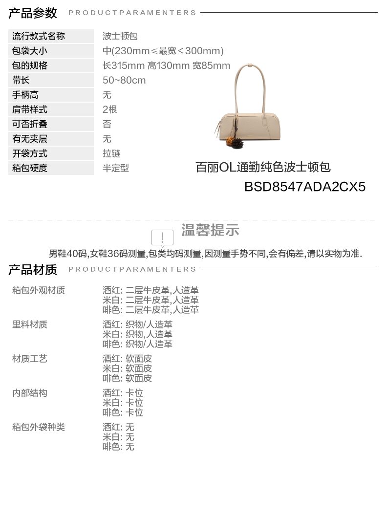 | 色系:米色 | 适用场景:通勤 | 开袋方式:拉链 | 性别:女子 | 是否防水:否 |