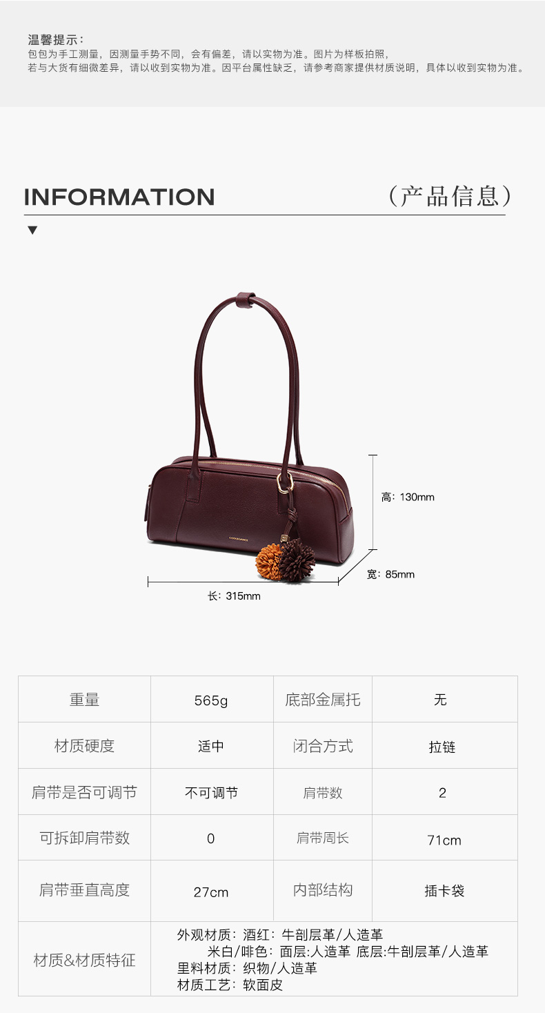 | 包的规格:W315*H130*D85mm | 闭合方式:拉链 | 背带方式:单肩 | 内部结构:卡位 | 风格:OL通勤 |
