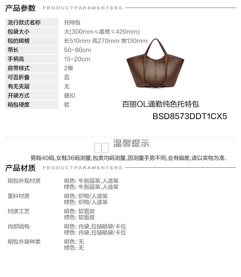 | 色系:咖啡色 | 适用场景:通勤 | 开袋方式:磁扣 | 性别:女子 | 是否防水:否 |