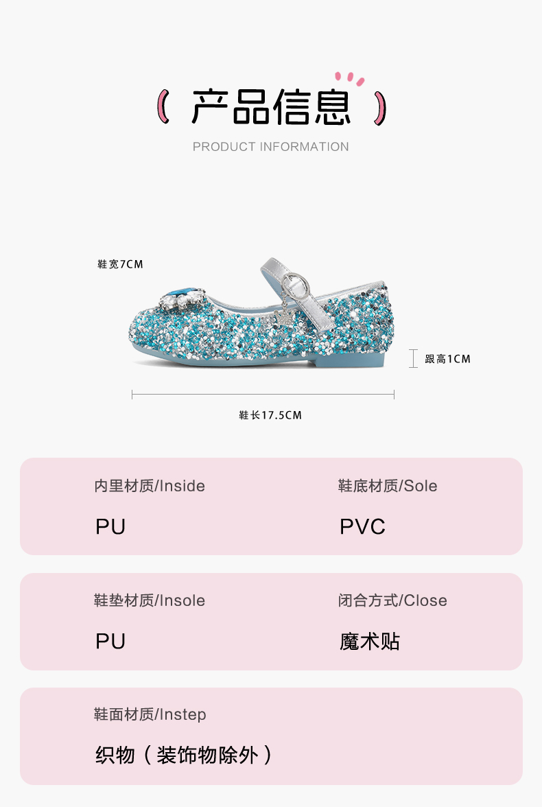 | 色系:蓝色 | 鞋头:圆头 | 性别:女童 | 里料材质:PU革 | 上市时间:2025年春季 |