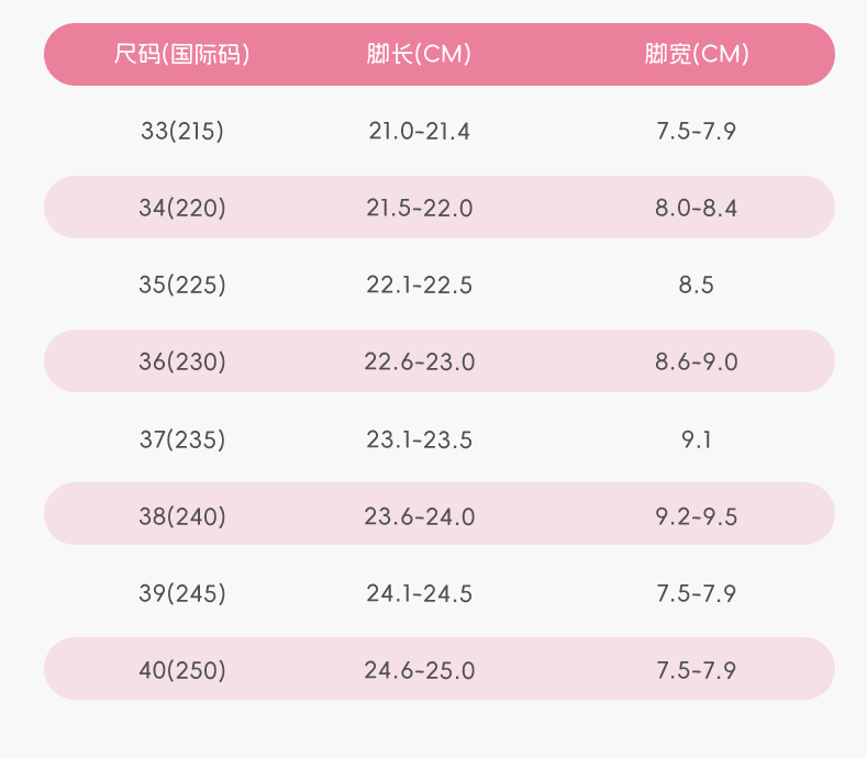 | 适合脚长(mm) | 110 | 120 | 125 | 130 | 135 | 140 | 150 | 155 | 160 | 170 | 175 | 180 | 190 | 195 | 200 | 210 | 215 | 220 | 230 | 235 | 240 | 245 | 250 | 255 | 260 |