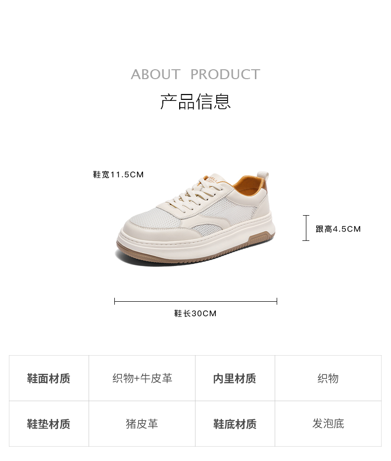 | 风格:休闲 | 色系:白色 | 跟高数值:4.5CM | 40码鞋宽参考(男):11.5CM | 性别:男子 |