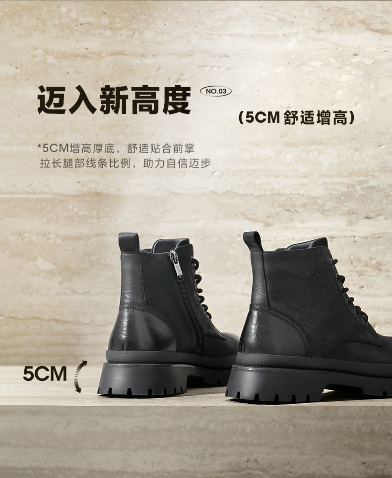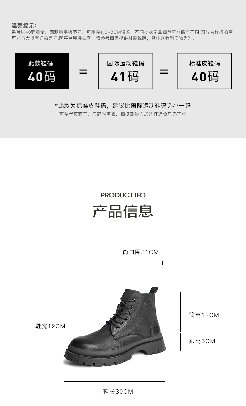 | 色系:黑色 | 跟高数值:4.5CM | 40码鞋宽参考(男):12CM | 筒高数值:12CM | 性别:男子 |