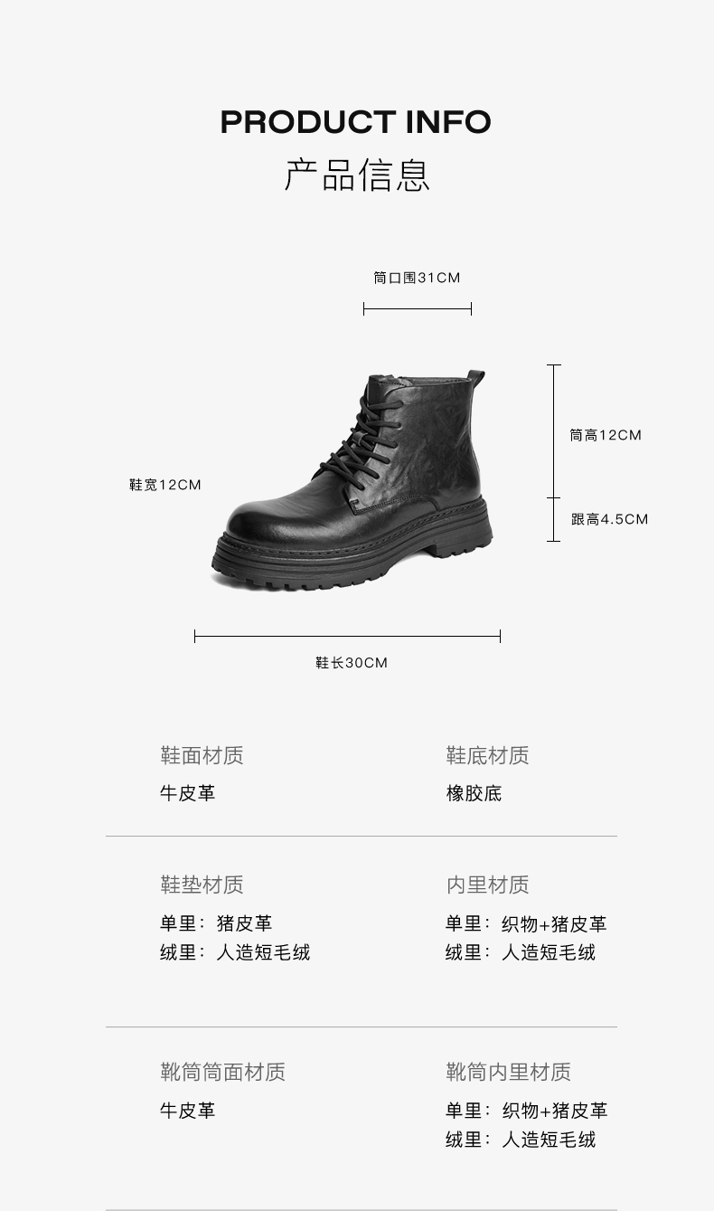 | 款式季节:冬季 | 鞋垫材质:猪皮革 | 鞋类流行款式:马丁靴 |