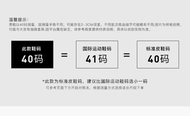| 鞋面材质:牛皮革 | 适用场合:日常休闲 | 闭合方式:套脚 | 所在区域:省仓 | 40码鞋宽参考(男):11CM |