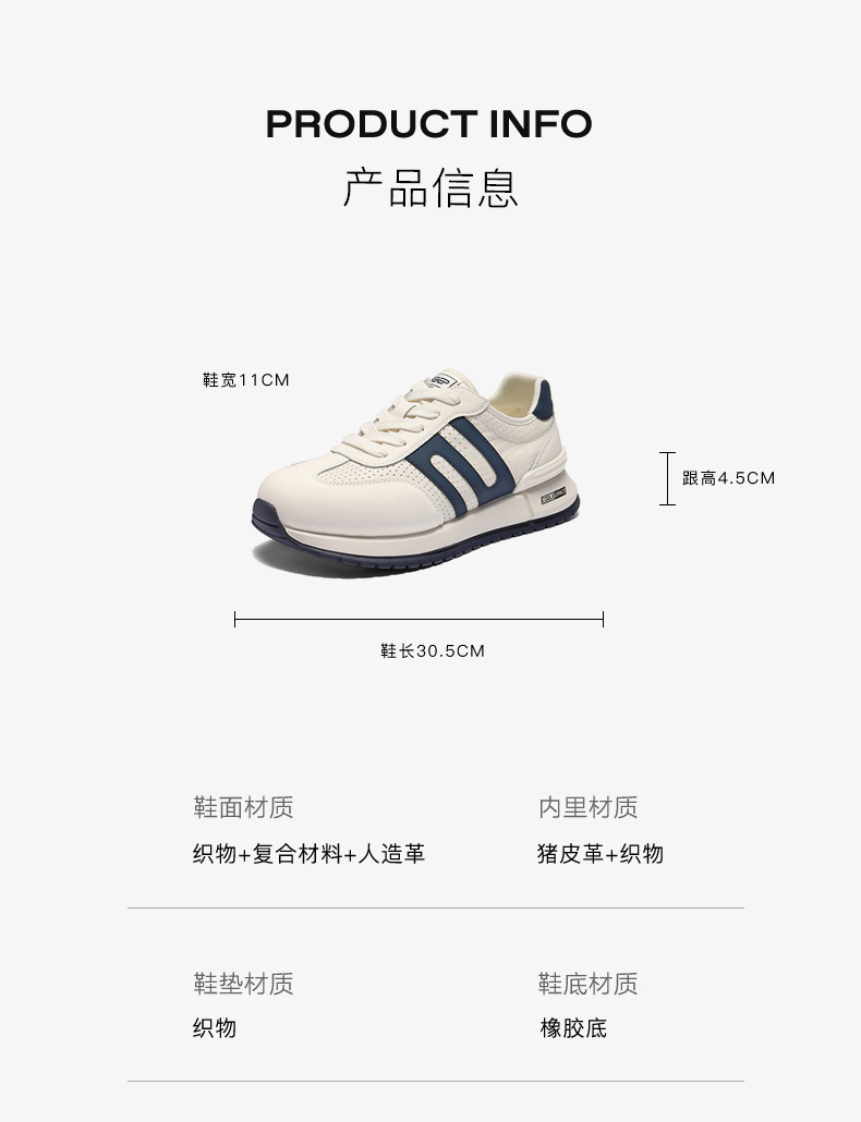 | 风格:休闲 | 色系:白色 | 跟高数值:4.5CM | 40码鞋宽参考(男):11CM | 性别:男子 |