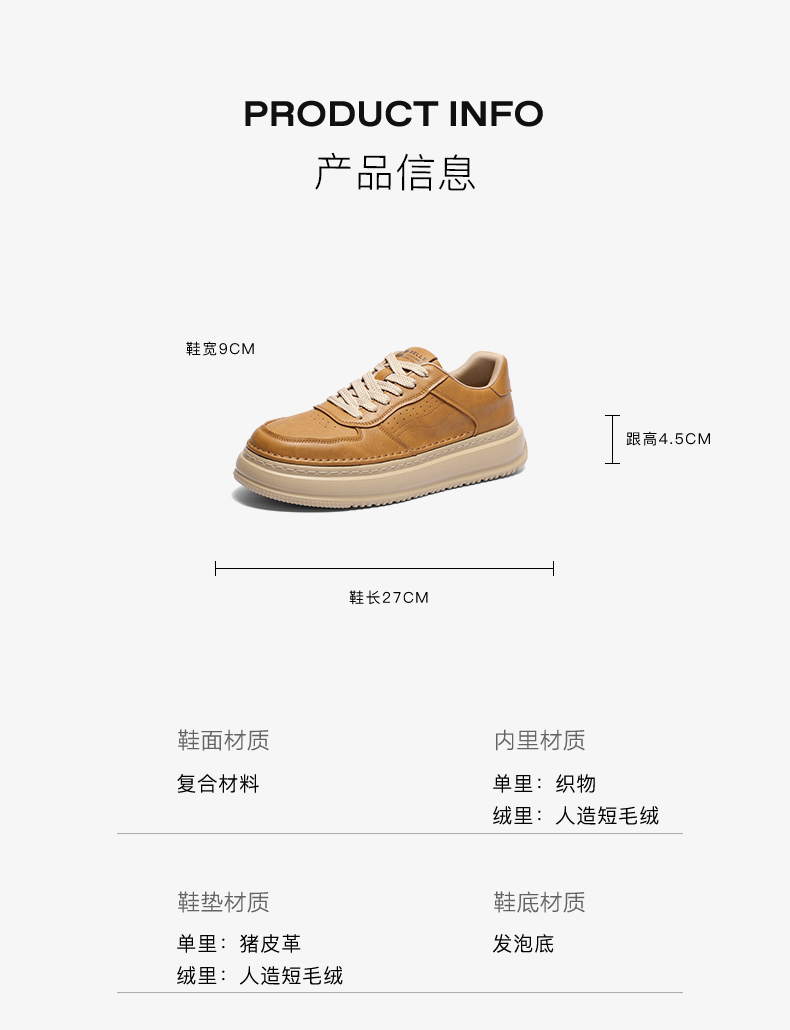 | 风格:休闲 | 色系:棕色 | 跟高数值:4.5CM | 40码鞋宽参考(男):9CM | 性别:男子 |
