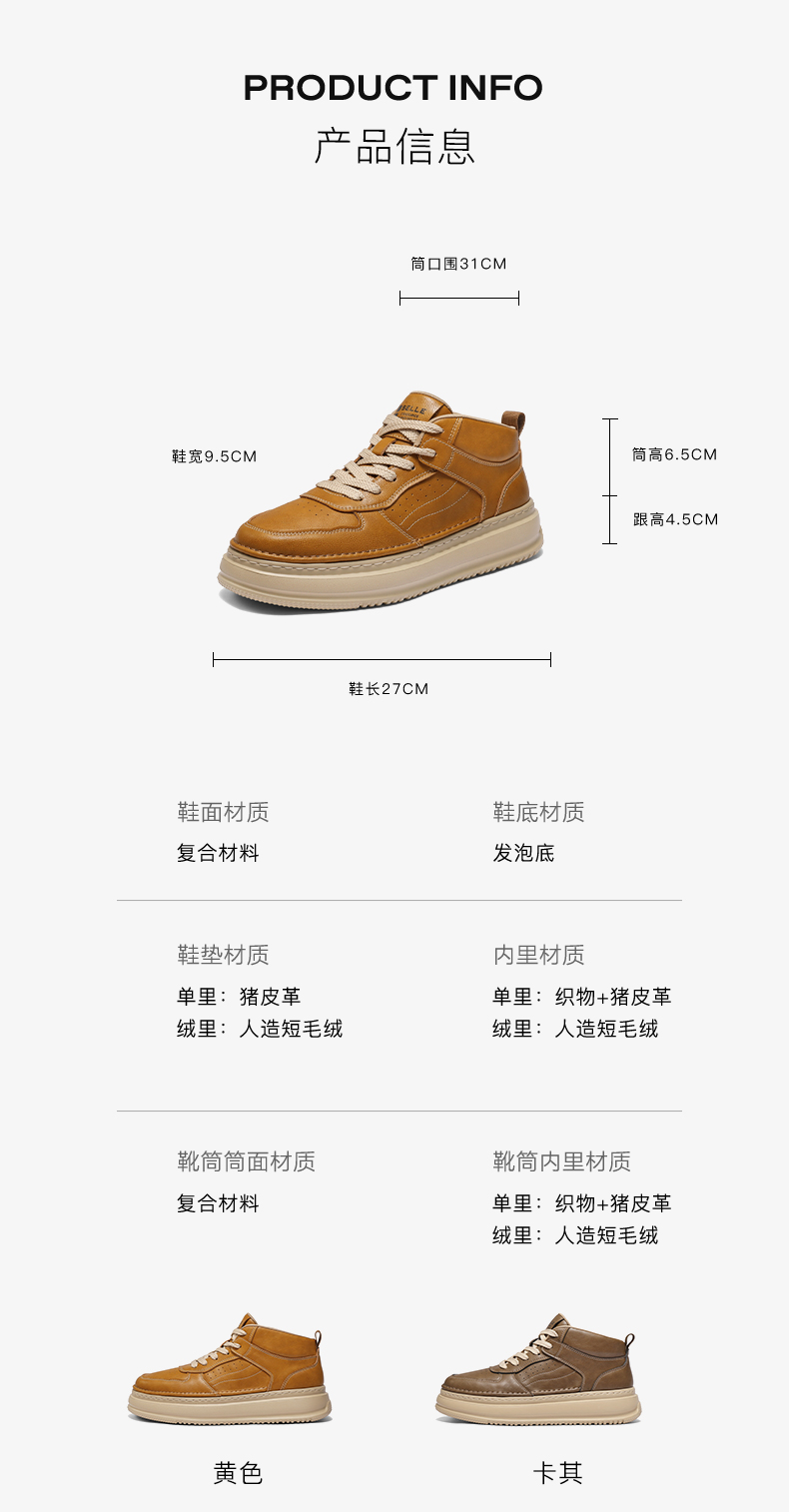 | 风格:休闲 | 色系:黄色 | 跟高数值:4.5CM | 40码鞋宽参考(男):9CM | 筒高数值:6.5CM |
