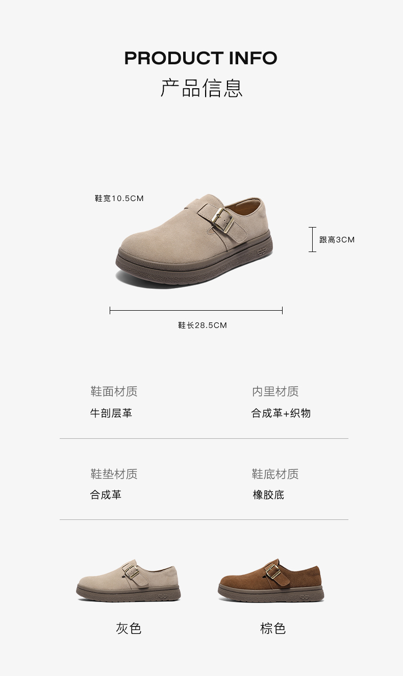 | 内增高:无 | 鞋跟形状:平跟 | 鞋面材质:牛剖层革 | 流行元素:纯色 | 闭合方式:套脚 |