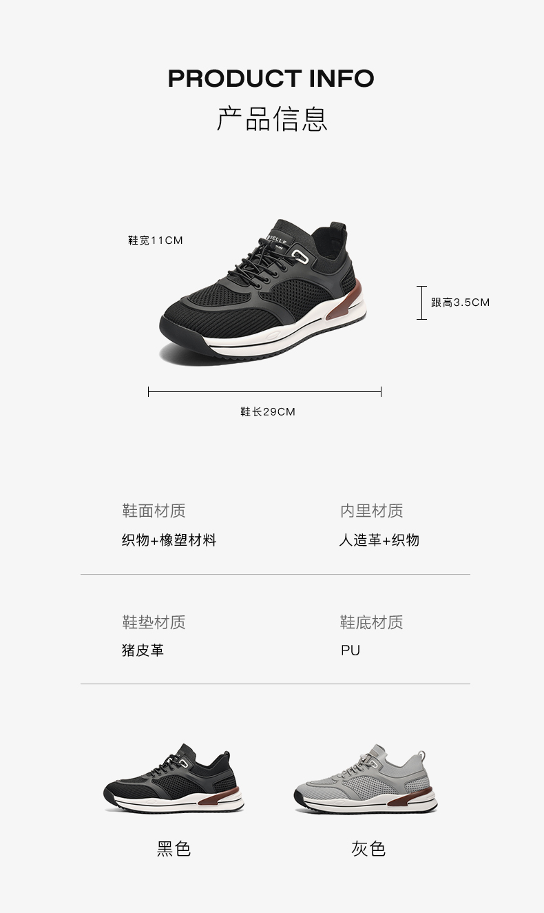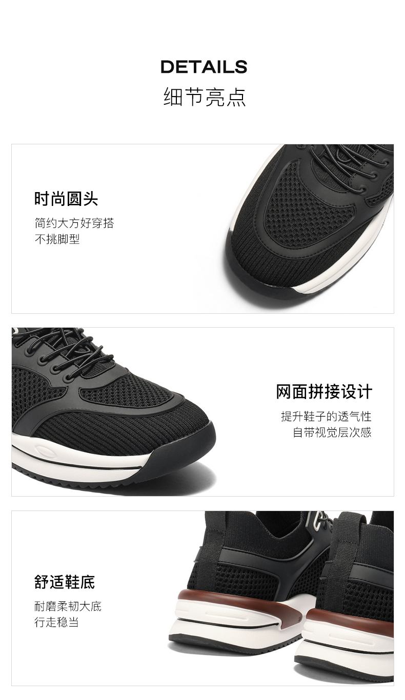 | 风格:运动 | 色系:黑色 | 跟高数值:3.5CM | 40码鞋宽参考(男):11CM | 性别:男子 |