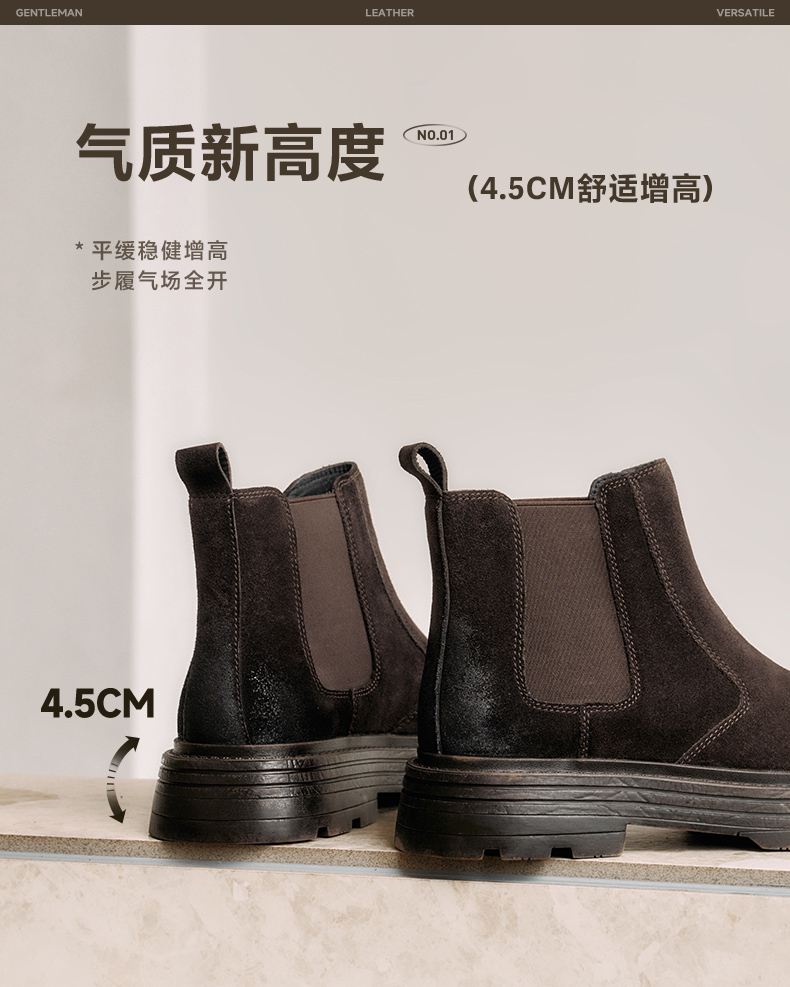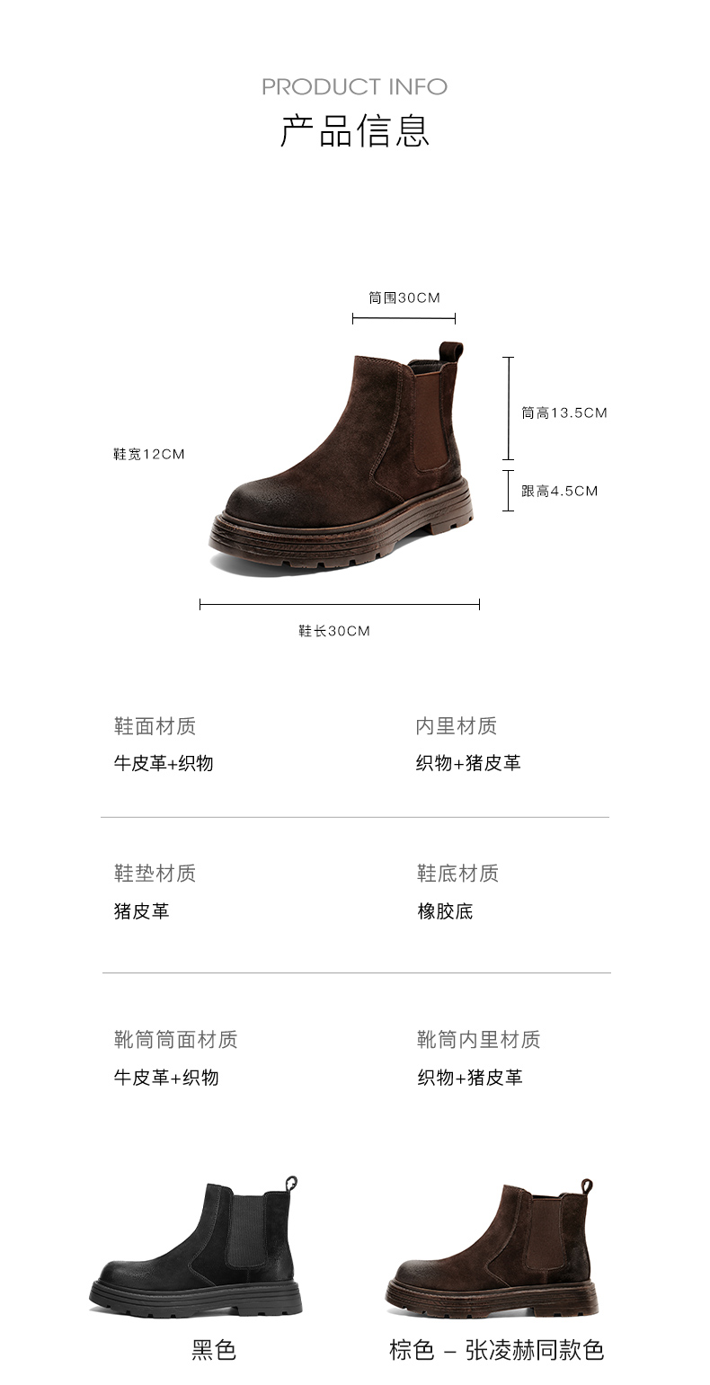 | 风格:休闲 | 色系:棕色 | 跟高数值:4.5CM | 40码鞋宽参考(男):12CM | 筒高数值:13.5CM |