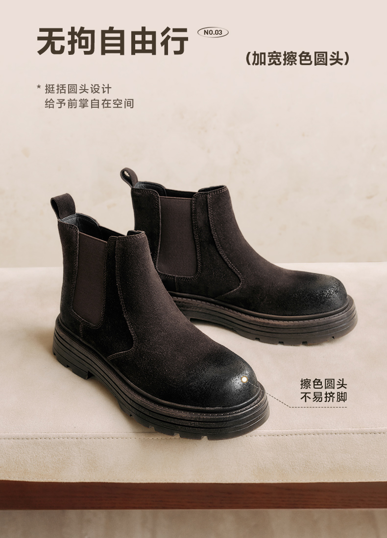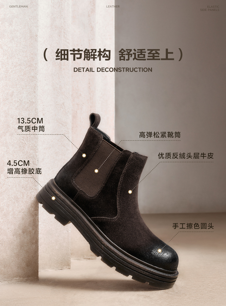 | 制鞋工艺:胶贴皮鞋 | 款式季节:冬季 | 鞋垫材质:猪皮革 | 鞋类流行款式:切尔西靴 |