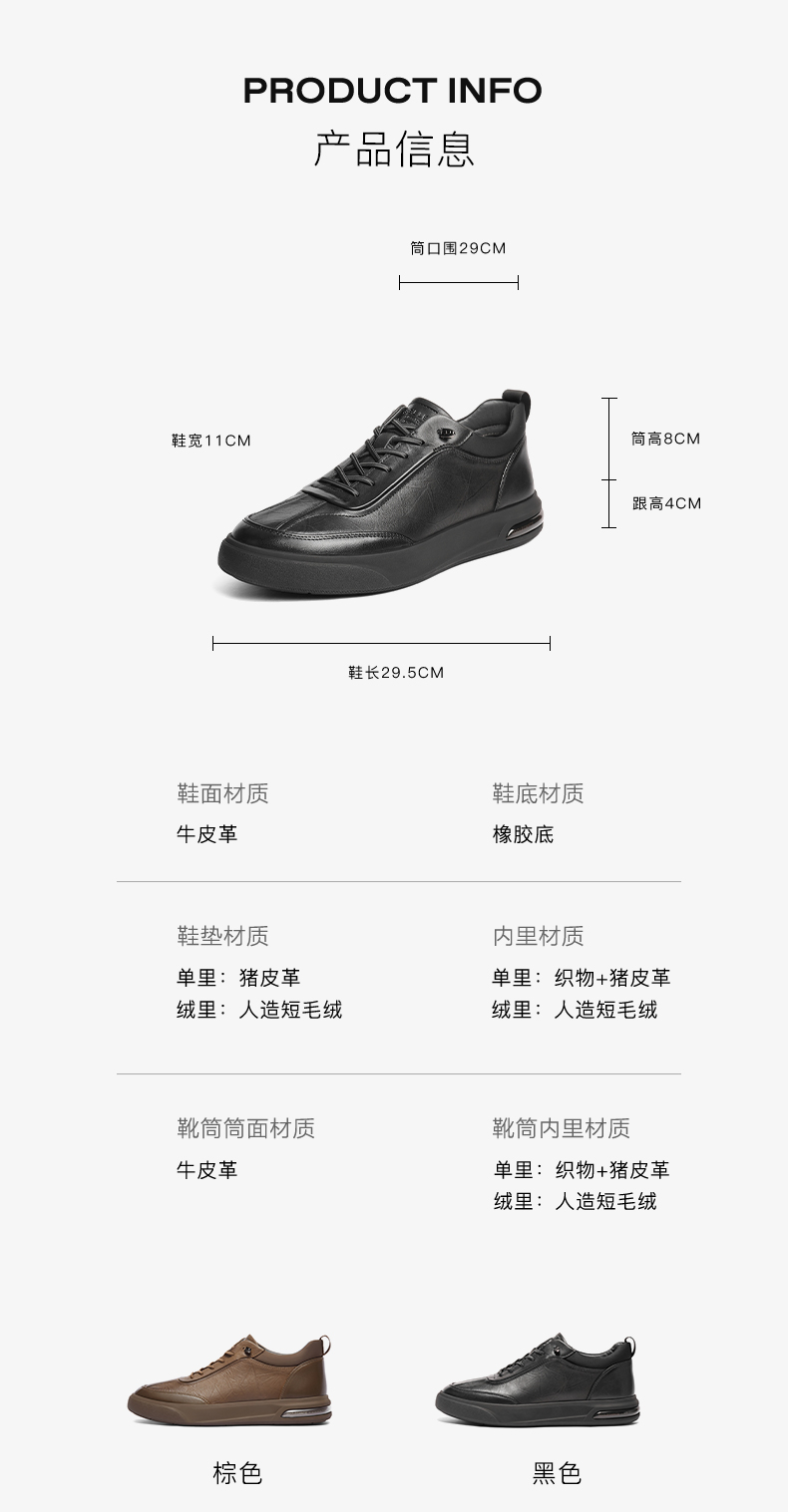 | 风格:休闲 | 色系:黑色 | 跟高数值:4CM | 40码鞋宽参考(男):11CM | 筒高数值:8CM |