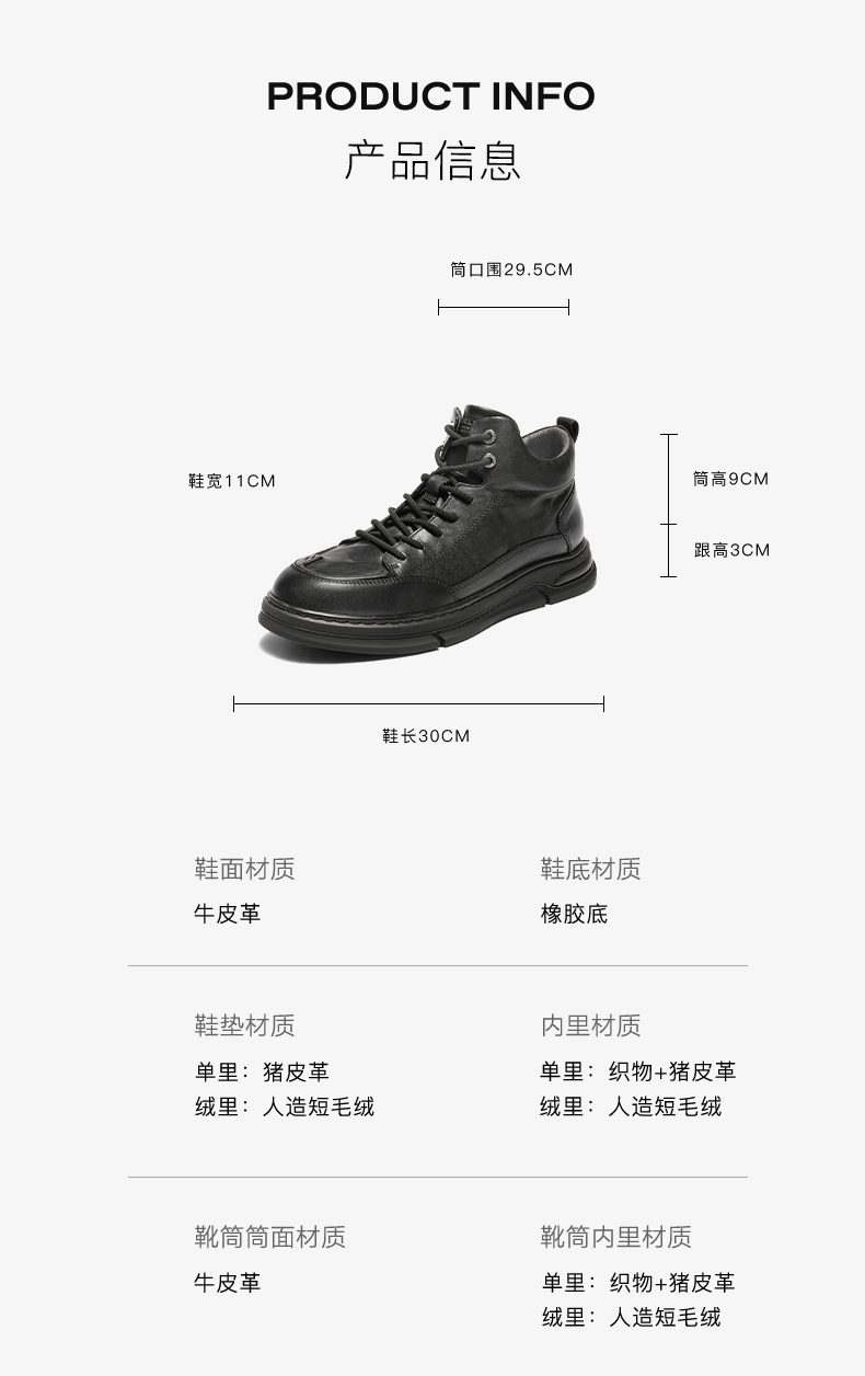 | 风格:休闲 | 色系:黑色 | 跟高数值:3CM | 40码鞋宽参考(男):11CM | 筒高数值:9CM |