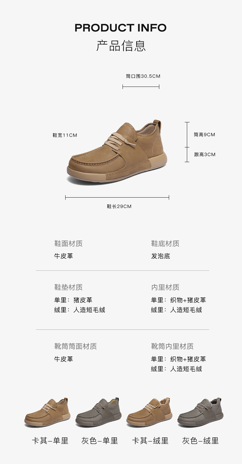 | 风格:休闲 | 色系:卡其 | 跟高数值:3CM | 40码鞋宽参考(男):11CM | 筒高数值:9CM |