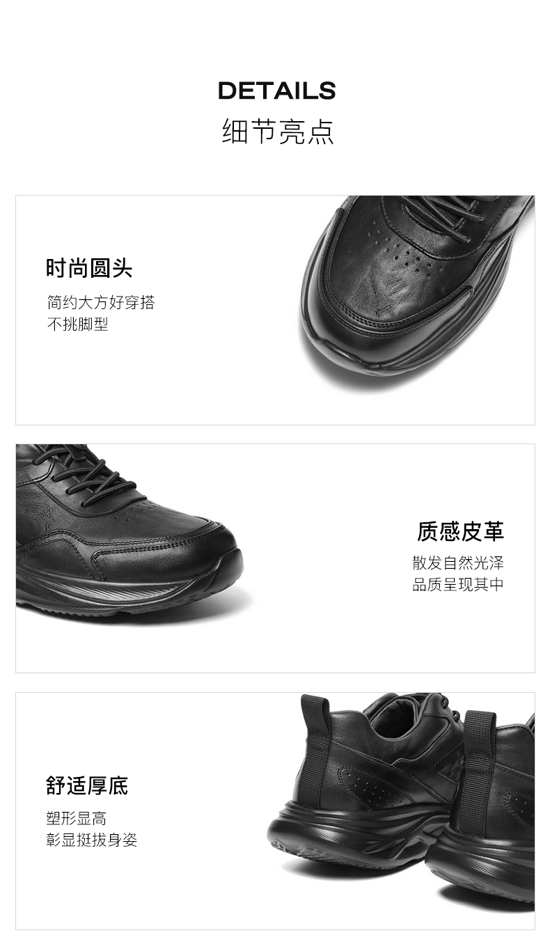 | 风格:休闲 | 色系:黑色 | 跟高数值:4.5CM | 40码鞋宽参考(男):11CM | 性别:男子 |