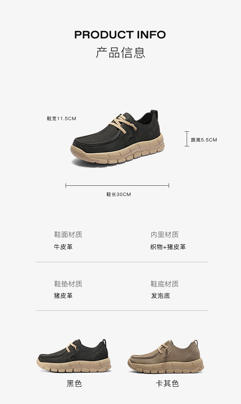 | 风格:休闲 | 色系:卡其 | 跟高数值:5.5CM | 40码鞋宽参考(男):11.5CM | 性别:男子 |