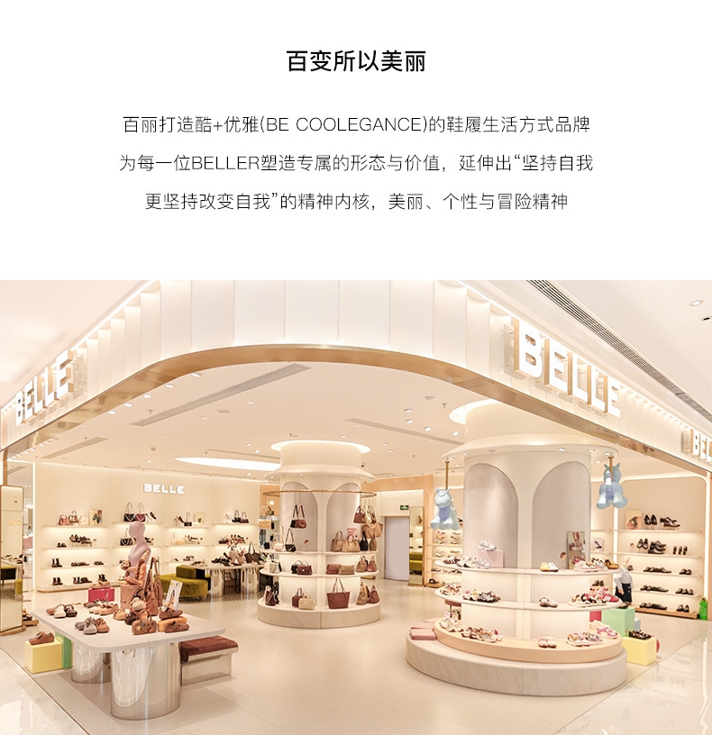 BeLLE(百丽),百变所以美丽。主张多变多元的新生代态度,不断融合潮流趋势,拥抱不同的生活体验与生活经历。将女性的百变魅力注入到鞋履设计中,让女人在不同的人生阶段,不同的场合,不同的潮流趋势下,尽显自己自信的一面。致力于为现代都市女性提供充满自由的行走体验。