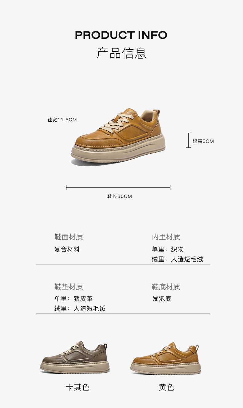 | 风格:休闲 | 色系:卡其 | 跟高数值:5CM | 40码鞋宽参考(男):11.5CM | 性别:男子 |