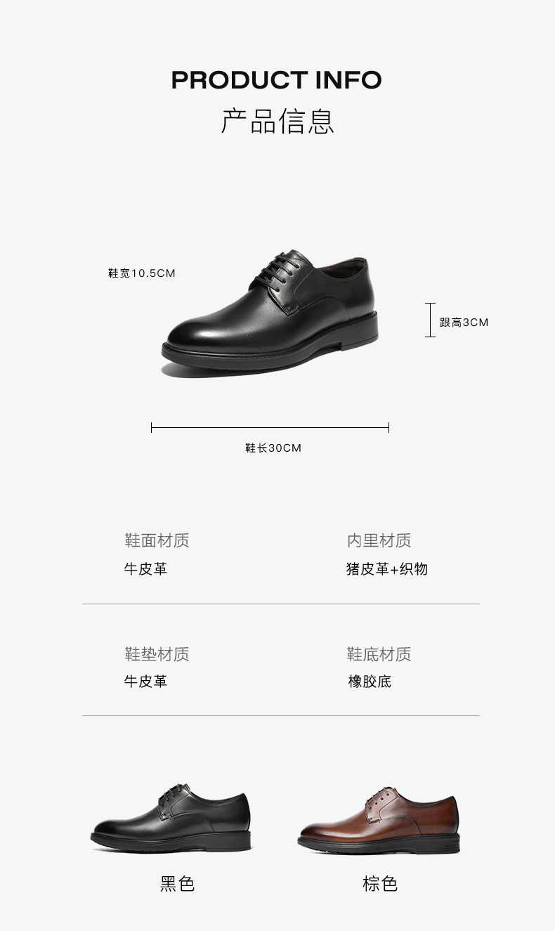 | 风格:商务 | 色系:棕色 | 跟高数值:3CM | 40码鞋宽参考(男):10.5CM | 性别:男子 |