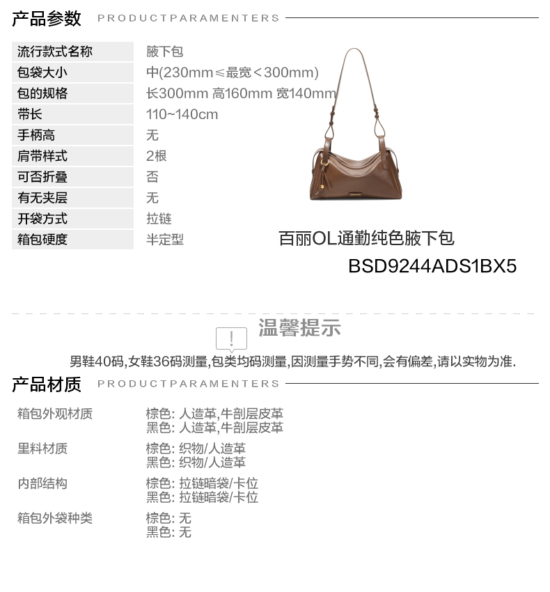 | 包的规格:W300*H160*D140mm | 内部结构:拉链暗袋/卡位 | 背带方式:单肩/斜挎 | 风格:OL通勤 | 色系:棕色 |