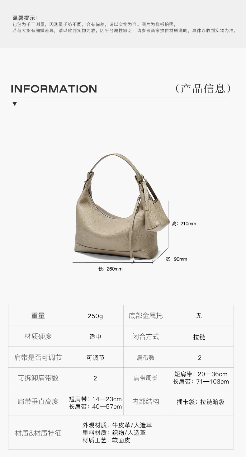 | 包的规格:W260*H210*D90mm | 闭合方式:拉链 | 背带方式:单肩/斜挎 | 内部结构:拉链暗袋/卡位 | 风格:OL通勤 |