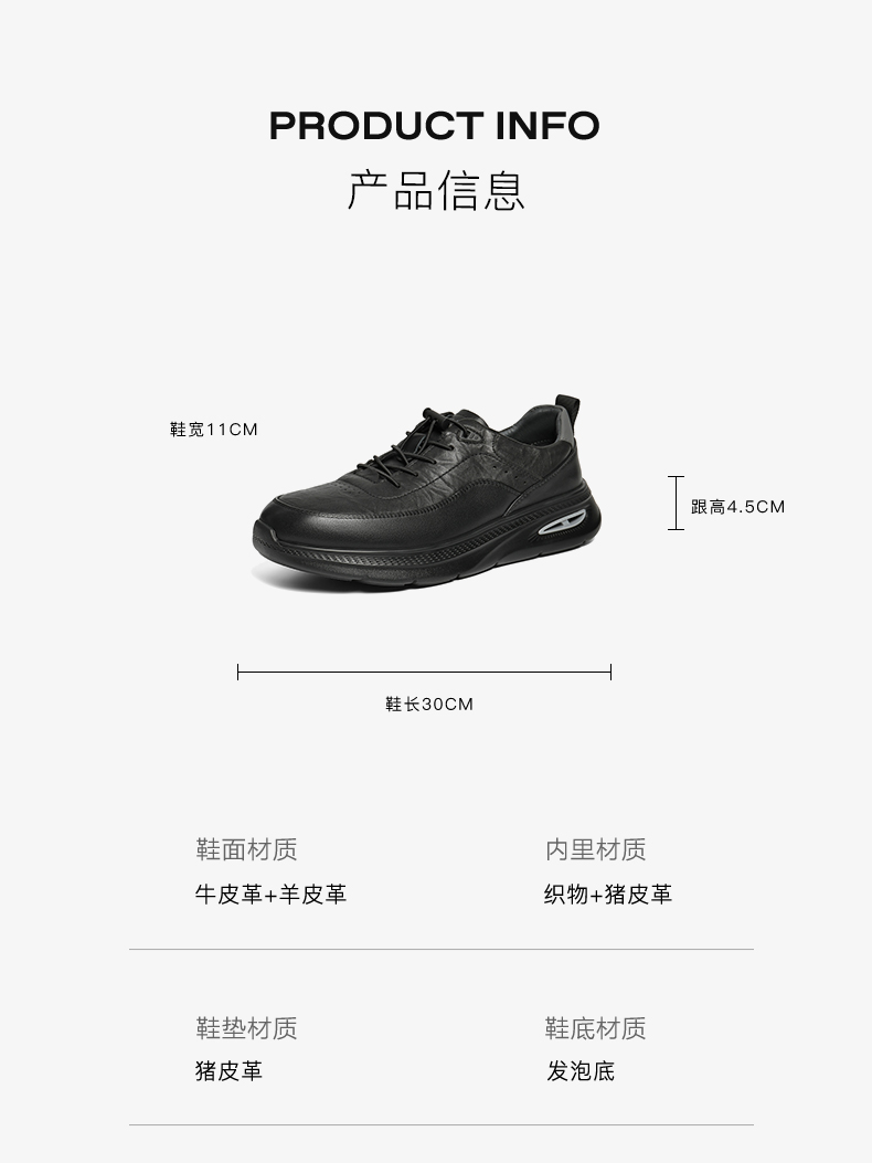 | 风格:休闲 | 色系:黑色 | 跟高数值:4.5CM | 40码鞋宽参考(男):11CM | 性别:男子 |