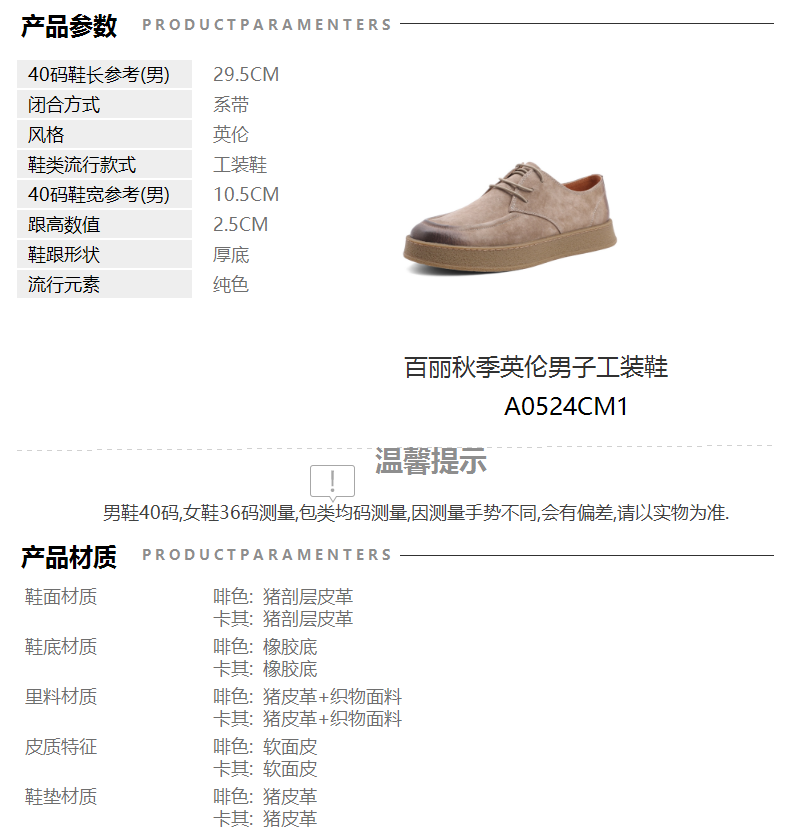 | 跟高数值:2.5CM | 货品来源:外购 | 40码鞋宽参考(男):10.5CM | 性别:男子男子 | 里料材质:猪皮革织物面料 |