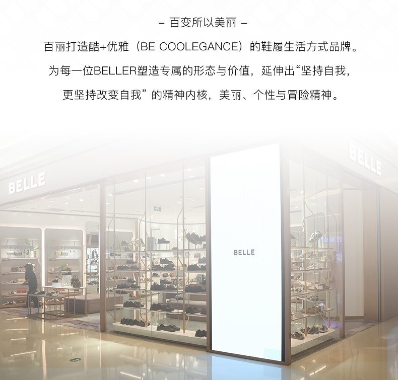 BeLLE(百丽),百变所以美丽。主张多变多元的新生代态度,不断融合潮流趋势,拥抱不同的生活体验与生活经历。将女性的百变魅力注入到鞋履设计中,让女人在不同的人生阶段,不同的场合,不同的潮流趋势下,尽显自己自信的一面。致力于为现代都市女性提供充满自由的行走体验。