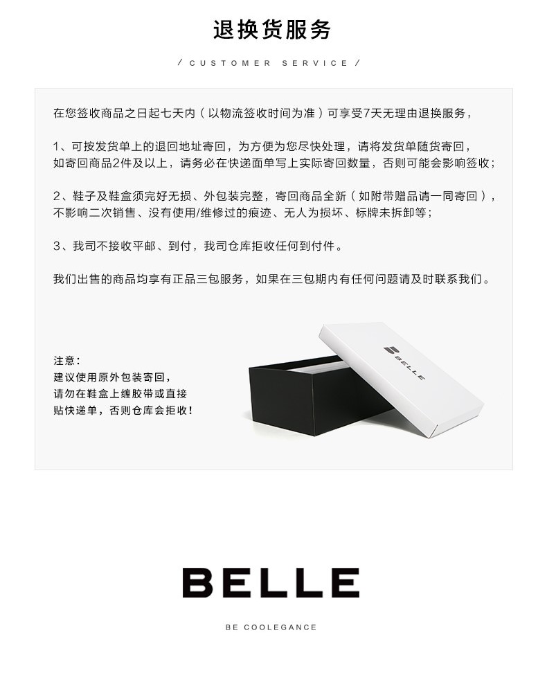 BeLLE(百丽),百变所以美丽。主张多变多元的新生代态度,不断融合潮流趋势,拥抱不同的生活体验与生活经历。将女性的百变魅力注入到鞋履设计中,让女人在不同的人生阶段,不同的场合,不同的潮流趋势下,尽显自己自信的一面。致力于为现代都市女性提供充满自由的行走体验。