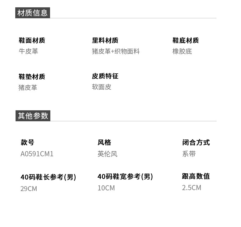 | 风格:商务 | 色系:黑色 | 跟高数值:2.5CM | 40码鞋宽参考(男):10CM | 性别:男子 |