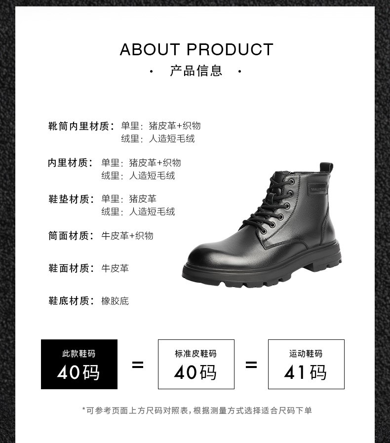 | 40码鞋长参考(男):30CM | 鞋底材质:橡胶底 | 靴筒内里材质:织物面料猪皮革 | 内增高:无 | 鞋面材质:牛皮革 |