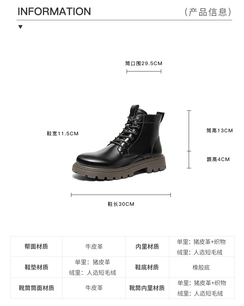 | 鞋类流行款式:马丁靴 | 鞋头款式:圆头 | 执行标准:舒适上班鞋Q/LR001-2023 | 鞋面图案:纯色 | 鞋跟形状:厚底 |