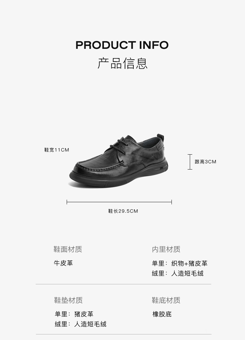 | 风格:商务休闲 | 色系:黑色 | 跟高数值:3CM | 40码鞋宽参考(男):11CM | 性别:男子 |