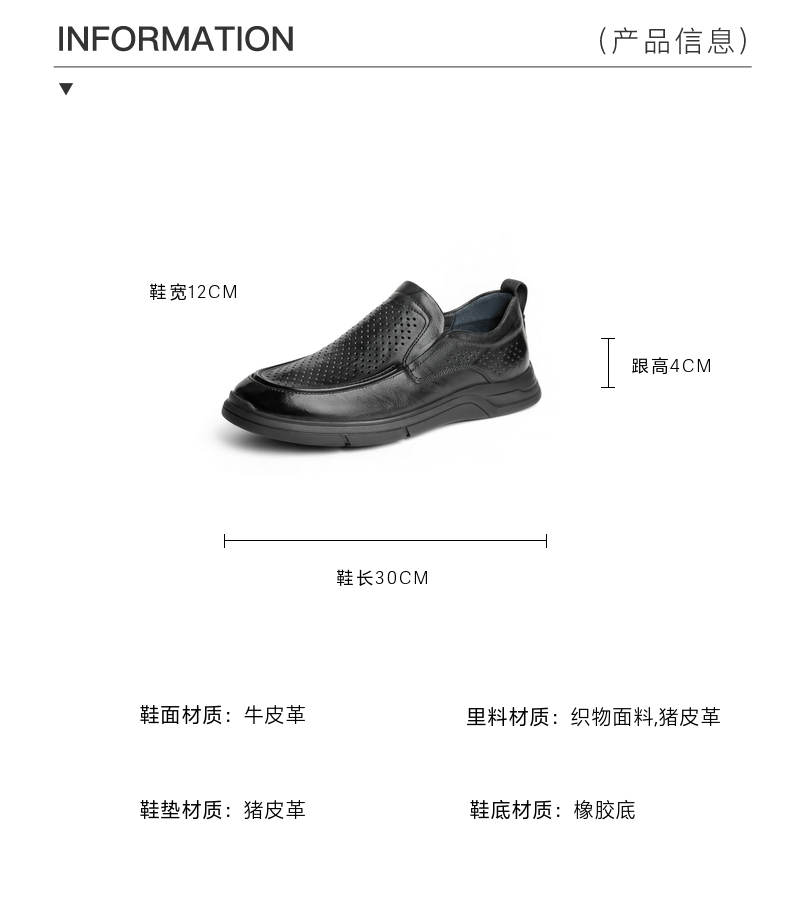| 内增高:无 | 鞋跟形状:厚底 | 鞋面材质:牛皮革 | 流行元素:打孔透气 | 闭合方式:套脚 |
