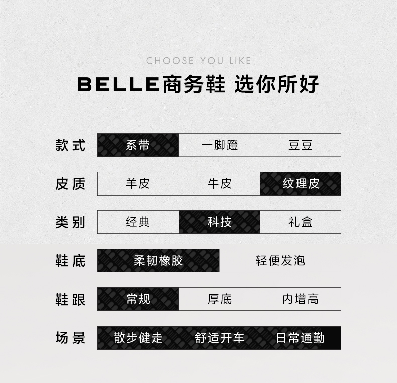 BeLLE(百丽),百变所以美丽。主张多变多元的新生代态度,不断融合潮流趋势,拥抱不同的生活体验与生活经历。将女性的百变魅力注入到鞋履设计中,让女人在不同的人生阶段,不同的场合,不同的潮流趋势下,尽显自己自信的一面。致力于为现代都市女性提供充满自由的行走体验。