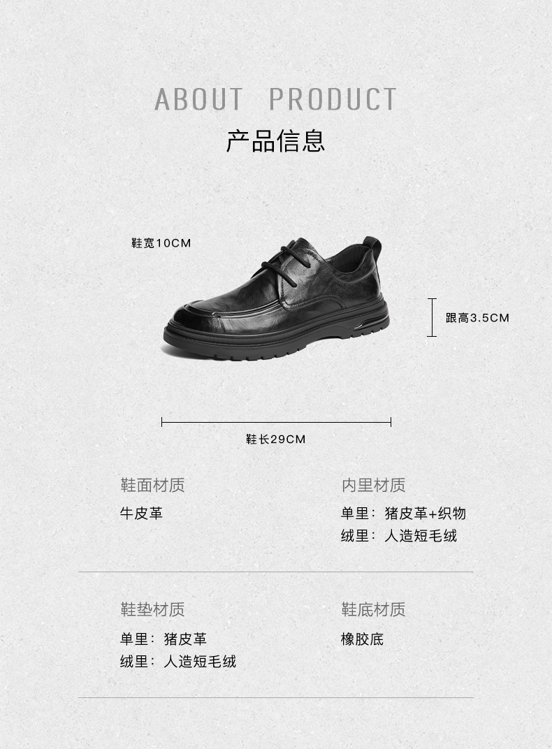 | 风格:休闲 | 色系:黑色 | 跟高数值:3.5CM | 40码鞋宽参考(男):10CM | 性别:男子 |