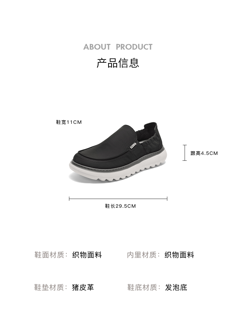 | 风格:休闲 | 色系:黑色 | 跟高数值:4.5CM | 40码鞋宽参考(男):11CM | 性别:男子 |