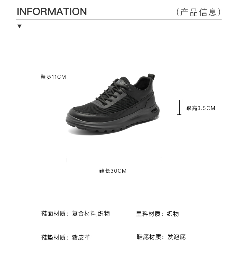 | 风格:运动休闲 | 色系:黑色 | 跟高数值:3.5CM | 40码鞋宽参考(男):11CM | 性别:男子 |