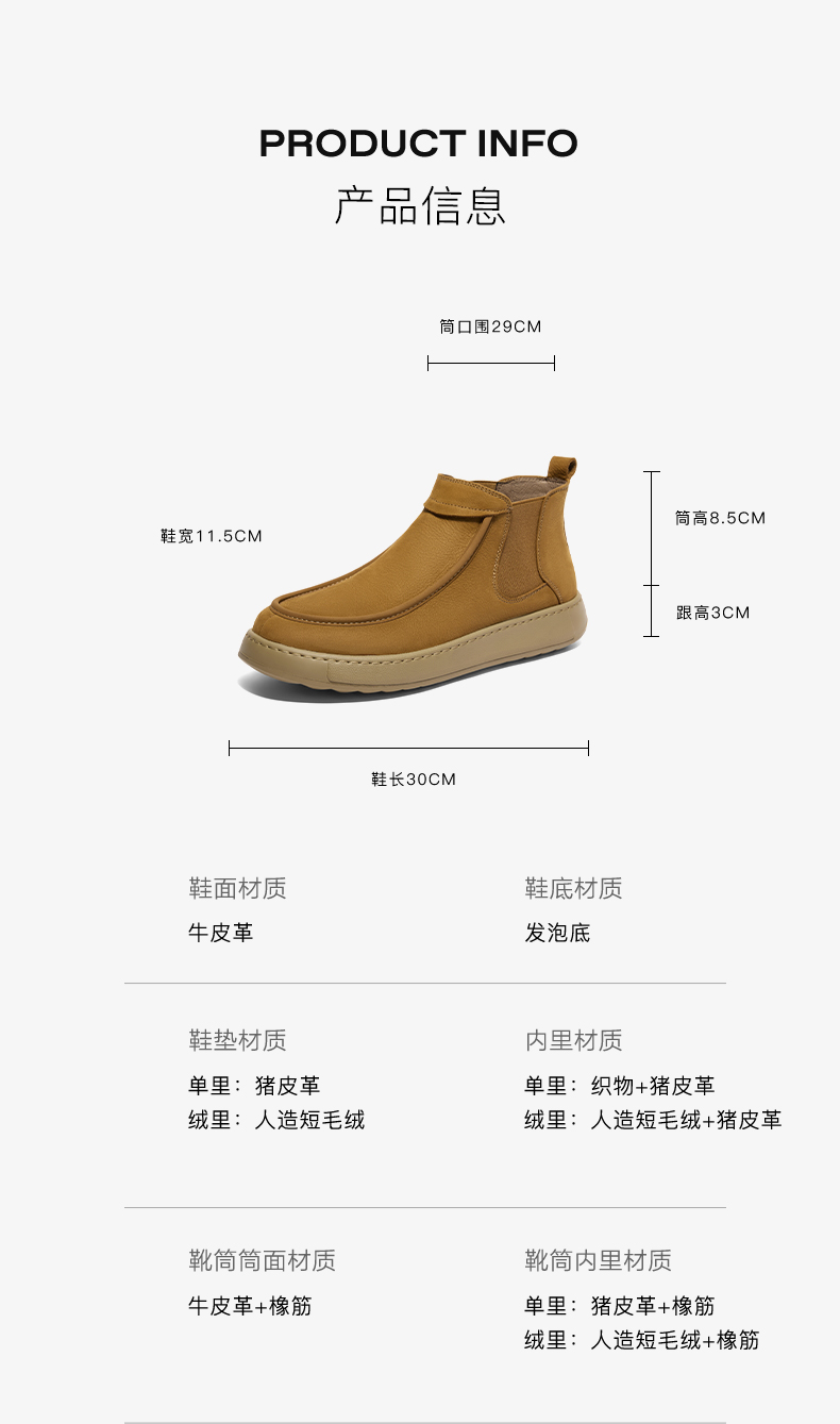 | 制鞋工艺:缝制鞋 | 鞋垫材质:猪皮革 | 款式季节:冬季 | 渠道划分:电商专销 | 销售季:2024年冬季 |