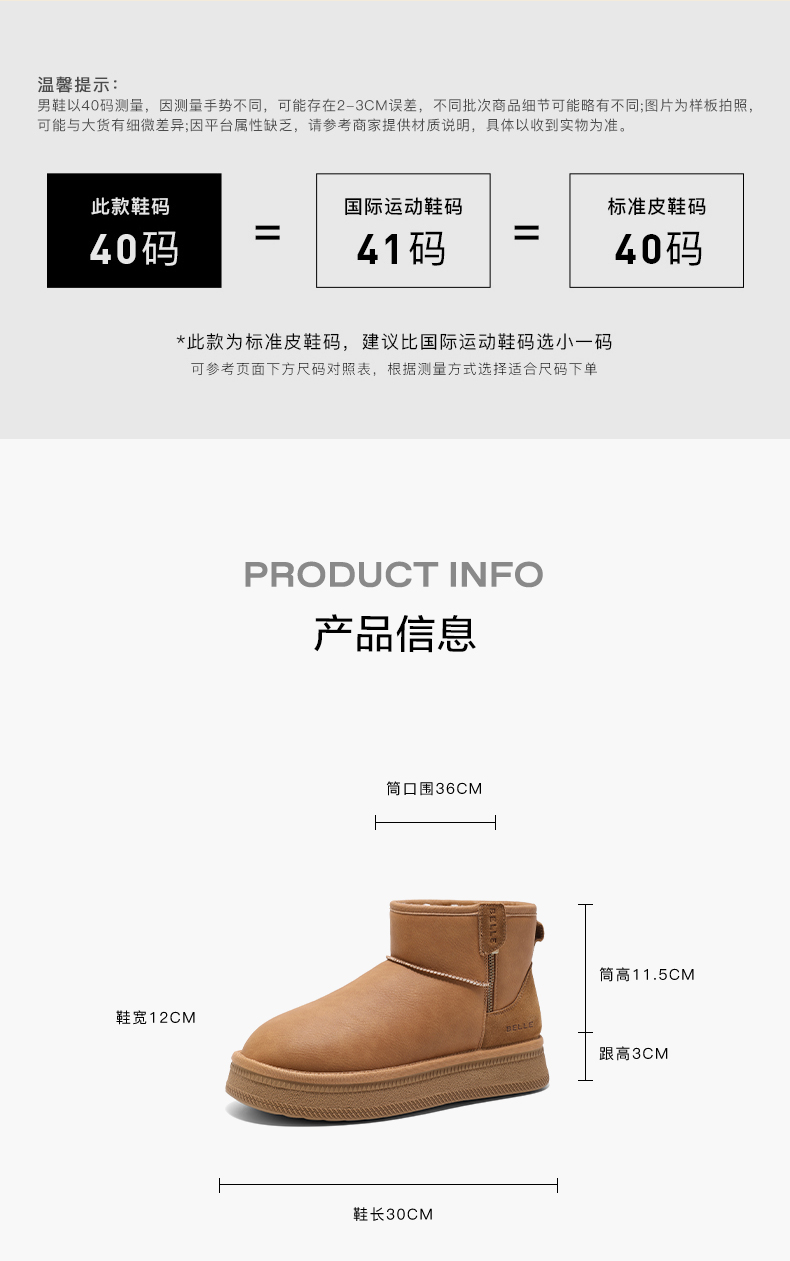 | 40码鞋宽参考(男):12CM | 靴筒口围:35CM | 风格分类:雪地靴 | 上市时间:2024年冬季 | 生产/经销/进口厂家:经销厂家:百丽电子商务(上海)有限公司 |