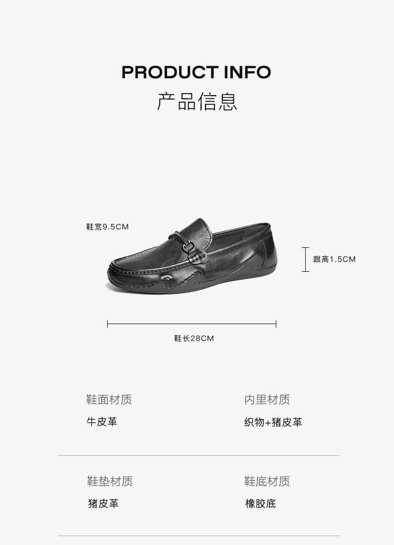 | 鞋面材质:牛皮革 | 适用场合:日常休闲 | 闭合方式:套脚 | 所在区域:电子商务 | 40码鞋宽参考(男):9.5CM |