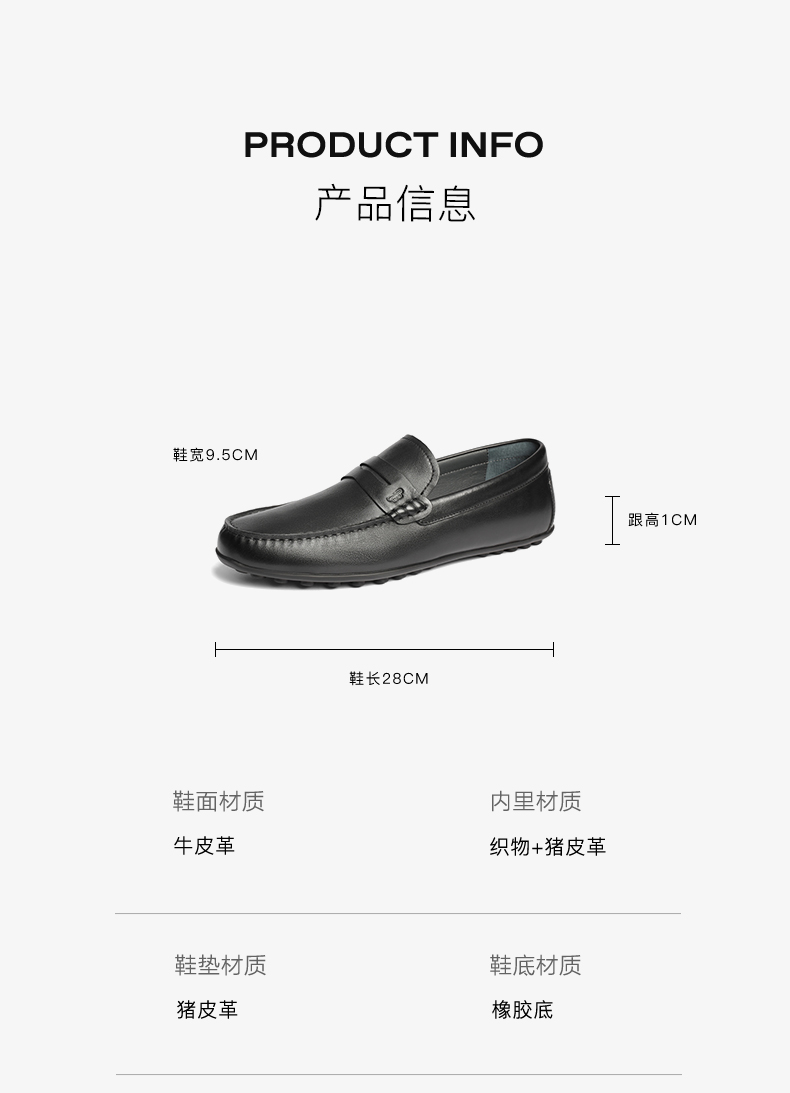 | 鞋面材质:牛皮革 | 适用场合:日常休闲 | 闭合方式:套脚 | 所在区域:电子商务 | 40码鞋宽参考(男):9.5CM |