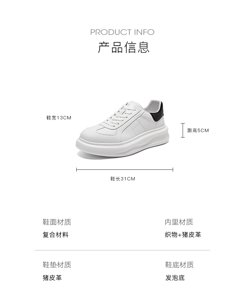 | 风格:休闲 | 色系:白色 | 跟高数值:5CM | 40码鞋宽参考(男):13CM | 性别:男子 |