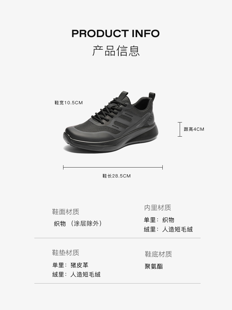 | 风格:运动休闲 | 色系:黑色 | 跟高数值:4CM | 40码鞋宽参考(男):10.5CM | 性别:男子 |