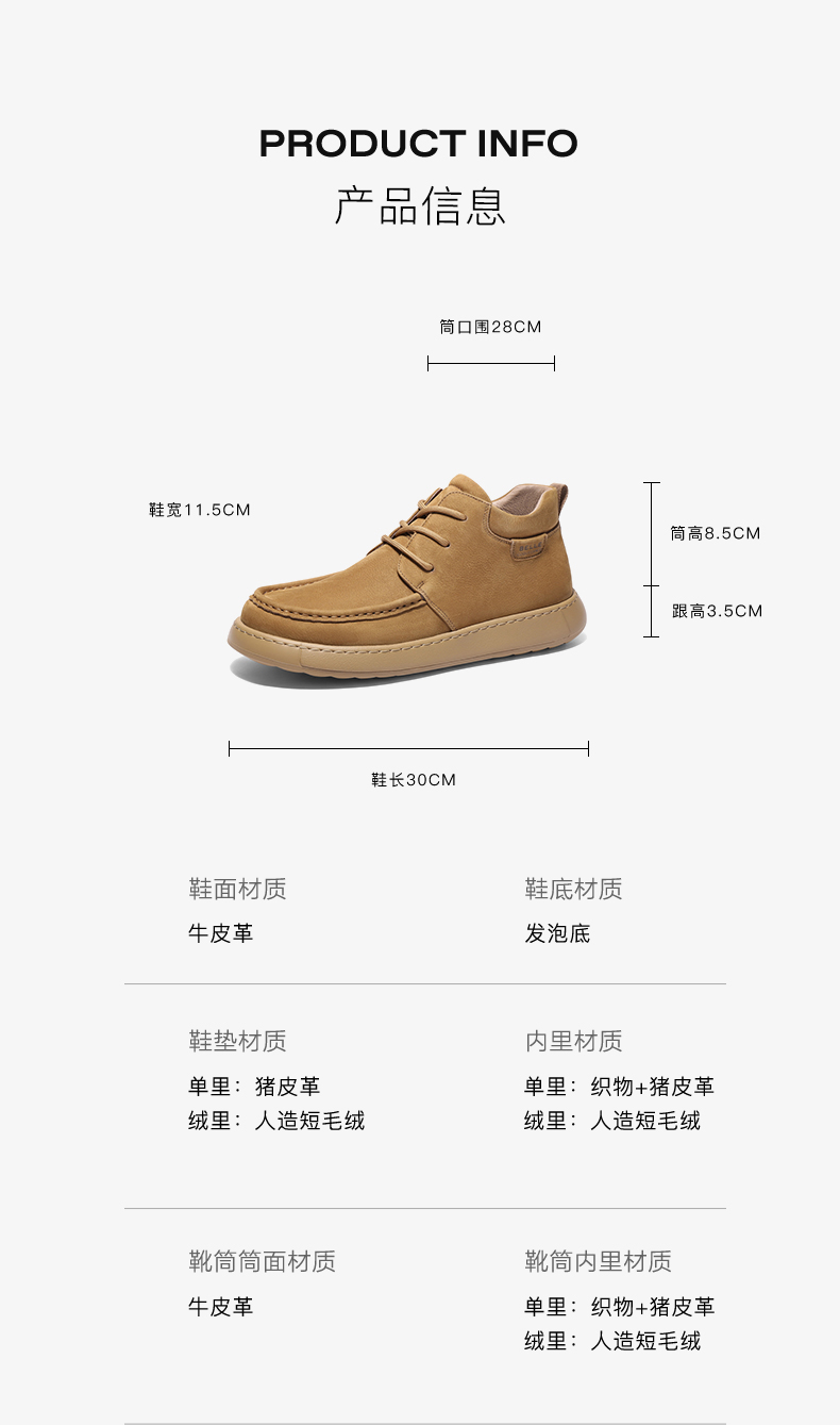 | 跟高数值:3.5CM | 筒高数值:8.5CM | 性别:男子 | 靴筒筒面材质:牛皮革 | 里料材质:人造短毛绒 |