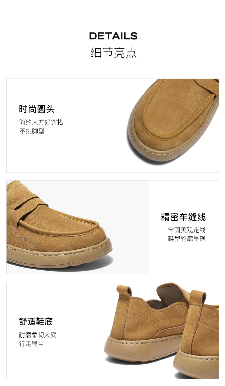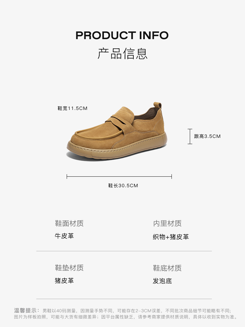 | 鞋面材质:牛皮革 | 适用场合:日常休闲 | 闭合方式:套脚 | 所在区域:电子商务 | 40码鞋宽参考(男):11.5CM |