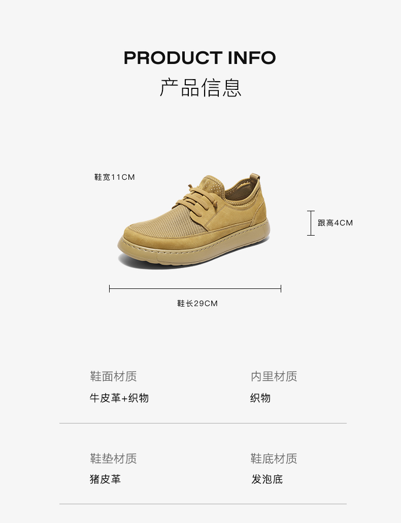 | 风格:休闲 | 色系:杏色 | 跟高数值:4CM | 40码鞋宽参考(男):11CM | 性别:男子 |