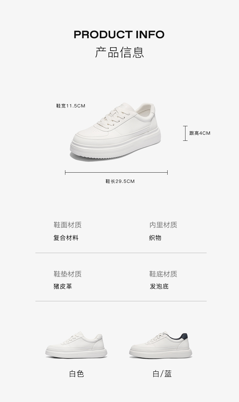 | 风格:休闲 | 色系:白色 | 跟高数值:4CM | 40码鞋宽参考(男):11.5CM | 性别:男子 |